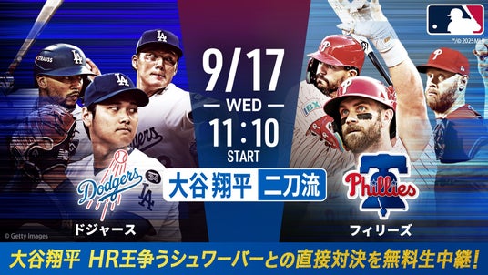 このたび、日本時間9月17日(水)午前11時10分より行われる大谷翔平選手が先発予定のロサンゼルス・ドジャースvsフィラデルフィア・フィリーズの1戦を無料生中継いたします。