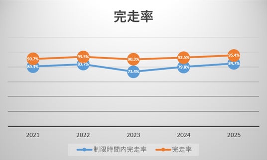 最終ゴール者までの完走率が5年平均で「92.5%」であるのに対し、制限時間6時間半以内でのゴール者は「80.4%」となっています。