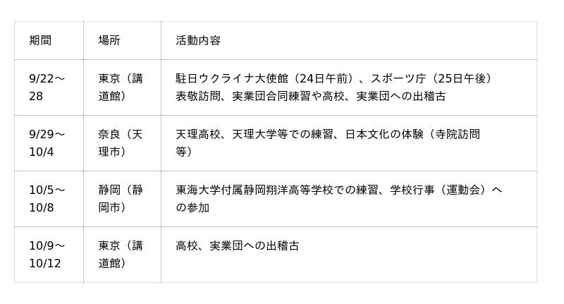公益財団法人全日本柔道連盟(以下「当連盟」)は、スポーツ庁が推進するスポーツ国際交流・協力事業Sport for Tomorrow(スポーツ・フォー・トゥモロー)(※)の一環として、2025年9月 22日から10月12日まで、ウクライナ柔道ジュニア選手団を日本に招聘いたします。