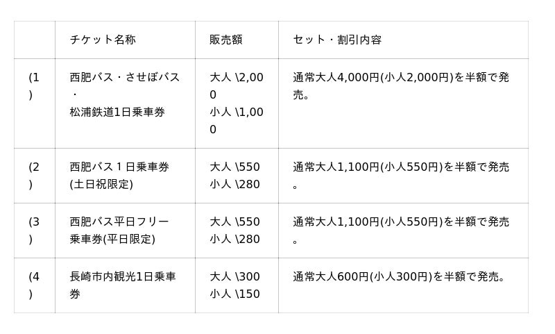 - 今回、割引販売する商品は、(1)「西肥バス・させぼバス・松浦鉄道1日乗車券」(西肥バス、させぼバス・松浦鉄道)、(2)「西肥バス1日乗車券(土日祝限定)」(西肥バス・させぼバス)、(3)「西肥バス平日フリー乗車券(平日限定)」(西肥バス・させぼバス)、(4)「長崎市内観光1日乗車券」 (長崎バス)の4つの乗車券です。