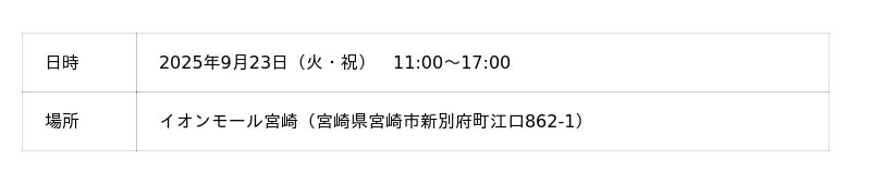2年後に開幕する「日本のひなた宮崎 国スポ・障スポ」について、「県民総参加型」の“おもてなしの心”あふれる大会の実現に向け、より皆さまに両大会への親しみを感じていただけるよう、9月23日(火・祝)にイオンモール宮崎でイベントを行います。