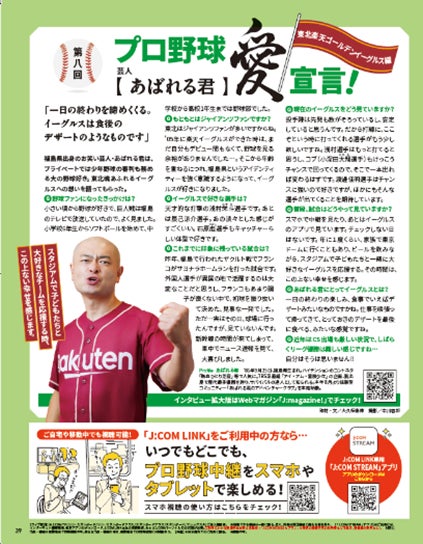 連載「プロ野球“愛”宣言!」は、J:COMご加入者さま向け番組ガイド誌「ジェイコム マガジン」ならびに“エンタメをもっと楽しむWebマガジン”「J:magazine!」(読み:ジェイマガジン)で毎月日本全国のプロ野球ファンにお届けしています。著名人の球団ファンになったきっかけや、ご自身の“リアル”な「プロ野球の応援&観戦スタイル」を語ります。第8回は「プライベートで少年野球の審判も務める大の野球好き」芸人・あばれる君の深すぎる“イーグルス愛”をお楽しみいただけます。