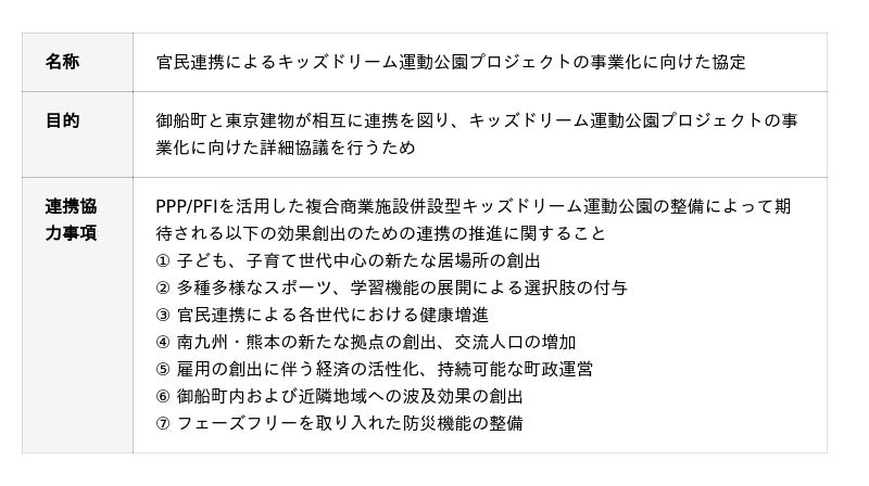 - 東京建物、熊本県上益城郡御船町と「官民連携基本協定」締結 「キッズドリーム運動公園プロジェクト」の実現に向け官民連携で推進