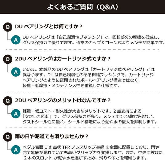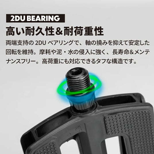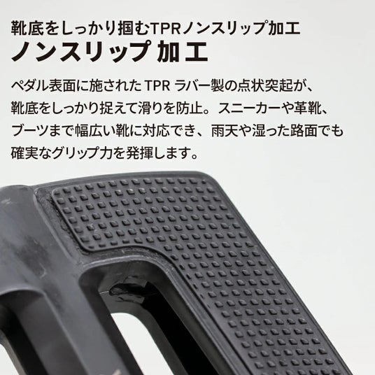 ペダル表面に施されたTPRラバー製の点状突起が、靴底をしっかり捉えて滑りを防止し、スニーカーや革靴、ブーツまで幅広い靴に対応でき、雨天や湿った路面でも確実なグリップ力を発揮します。
