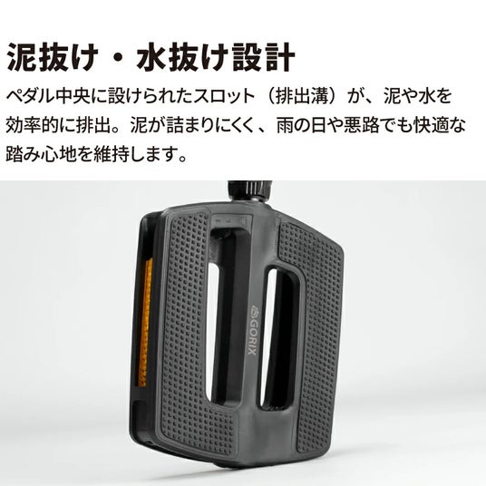 ペダル中央に設けられたスロット(排出溝)が、泥や水を効率的に排出。