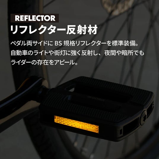 ペダル両サイドにBS規格リフレクターを標準装備しています。
