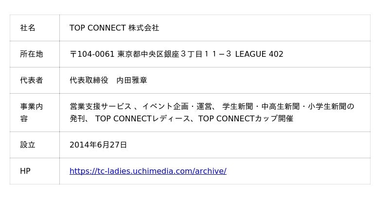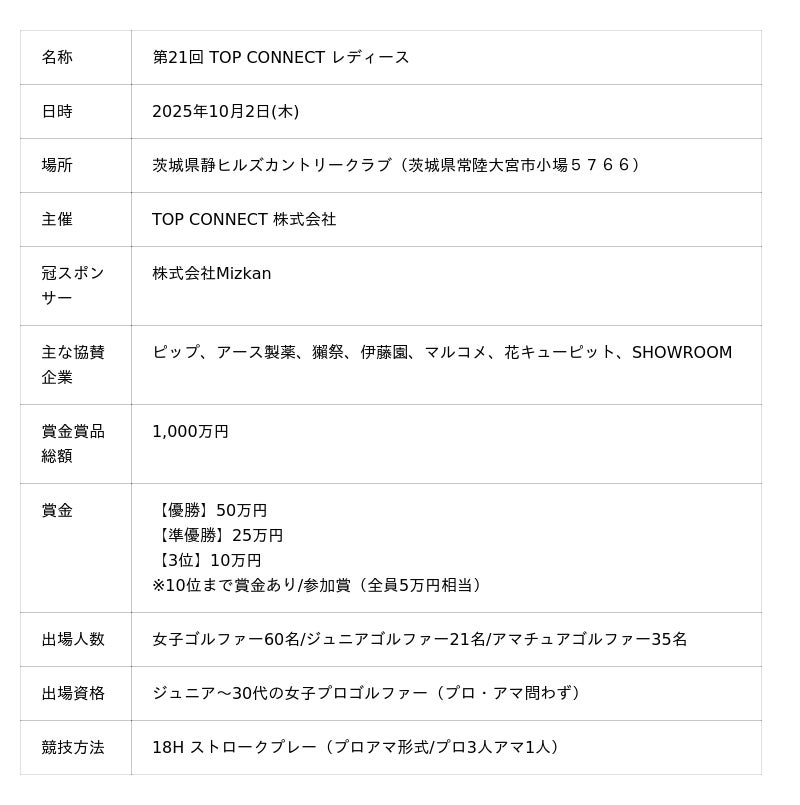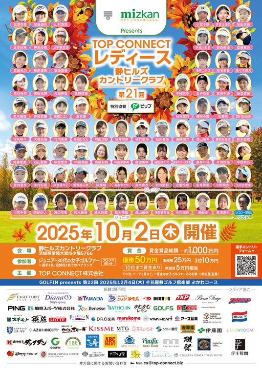 TOP CONNECT 株式会社(東京都中央区/代表取締役 内田雅章、以下 TOP CONNECT)は、ジュニア~30代のプロテスト合格を目指す若手女子ゴルファーの支援を目的にした「Mizkan Presents 第21回TOP CONNECT レディース」を、2025年10月2日茨城県静ヒルズカントリークラブ(茨城県常陸大宮市小場5766)にて開催します。「TOP CONNECTレディース」は、ツアーへの出場権を得られない女子プロとプロテスト合格を目指す若手女子ゴルファーを応援する目的で、年4回開催しています。