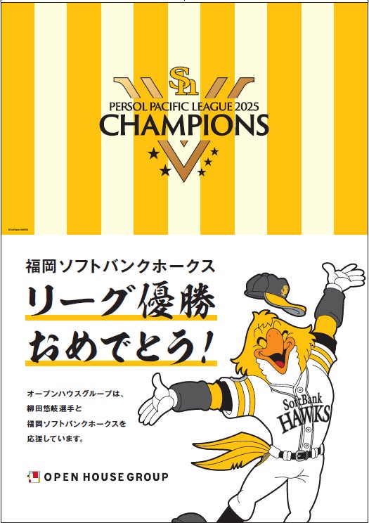 株式会社オープンハウスグループ(本社 東京都千代田区、代表取締役社長 荒井正昭、以下「当社」)は、福岡エリアの店舗、また、グループ会社である株式会社オープンハウス・ディベロップメントのマンションショールームにおいて、福岡ソフトバンクホークス(以下、ホークス)のリーグ優勝を記念して特別施策を実施することをお知らせいたします。