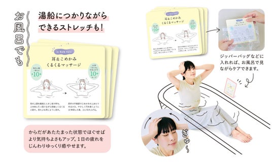 からだがあたたまった状態でほぐせばより気持ちよさもアップ! 1日の疲れをじんわりゆっくり癒やすルーティンの完成です。カードはジッパーバッグなどに入れれば、お風呂で見ながらケアできます。