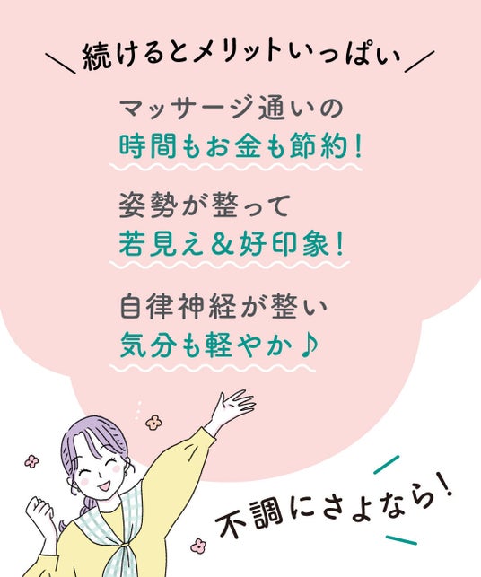 自宅で毎日できるストレッチだから、気軽に続けられます。効果を感じてきたら、マッサージに通う時間もお金も節約できるかも。ちょっと得した気分になれるのもうれしいポイントです。