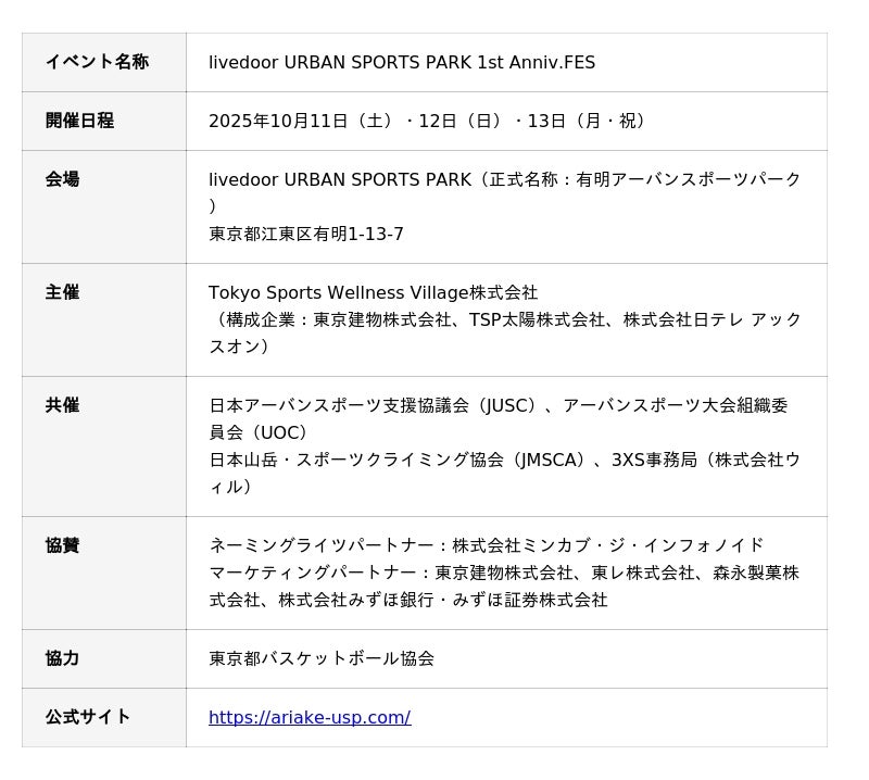 東京建物株式会社を代表企業とし、TSP太陽株式会社、株式会社日テレ アックスオンで構成するコンソーシアムが設立したTokyo Sports Wellness Village株式会社が運営する「livedoor URBAN SPORTS PARK」(東京都江東区有明、以下「本施設」)は、開業から1周年を迎えるにあたり、2025年10月11日(土)~13日(月・祝)の3日間にわたり「livedoor URBAN SPORTS PARK 1st Anniv.FES」(以下「本イベント」)を開催します。