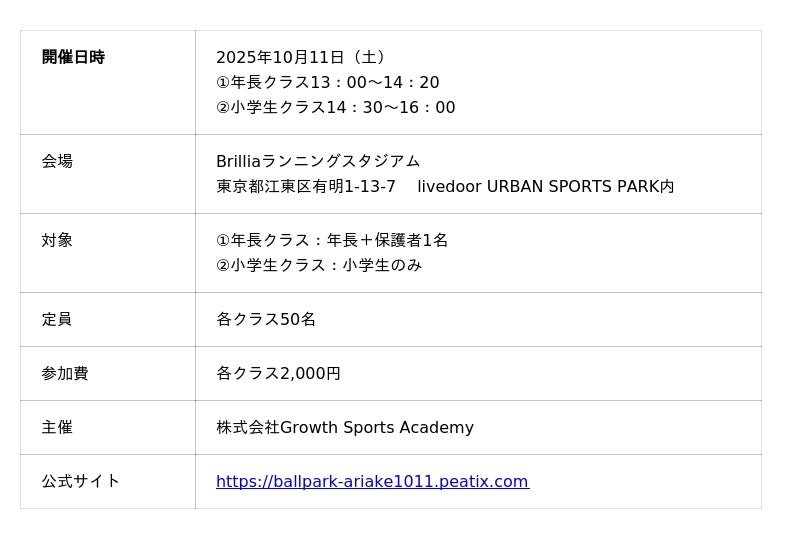 本イベントの開催期間中である10月11日(土)には、併設施設のBrilliaランニングスタジアムにて「GSA(Growth Sports Academy)ボールパークスポーツ体験会」を実施します。ラグビー元日本代表・斉藤祐也氏と世界陸上銀メダリスト・市橋有里氏による指導のもとラグビーやランニングを学ぶことができます。詳細はイベント公式サイトをご参照ください。