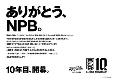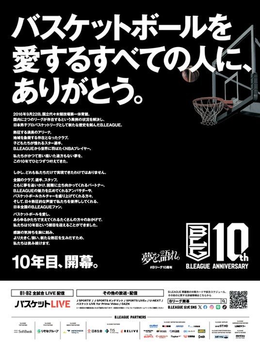 リーグ史上初・史上最多となる今回の感謝広告では、この10年間B.LEAGUEを支えてくださったファンの皆様はもちろんのこと、B.LEAGUEクラブ、選手、バスケットボール男子日本代表や、共にスポーツ界を盛り上げてきたプロ野球・Jリーグ、多くの選手が目標とするNBA、バスケットボールカルチャーを広めてくれた芸能関係者など、バスケットボールを愛し、あらゆる形で支えてくださった一人ひとりへ、「ありがとう」を贈るものです。本広告を通して、感謝の気持ちを日本中、そして世界へと届けるとともに、10月より開幕する新シーズンへの期待感を高め、日本のバスケットボールシーンをさらに盛り上げてまいります。