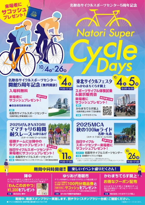 - 東北最大級のスポーツサイクルフェスティバル「東北サイクルフェスタ 2025」が、10月4日(土)・5日(日)宮城県名取市 特設イベント会場「かわまちてらす閖上」にて開催!