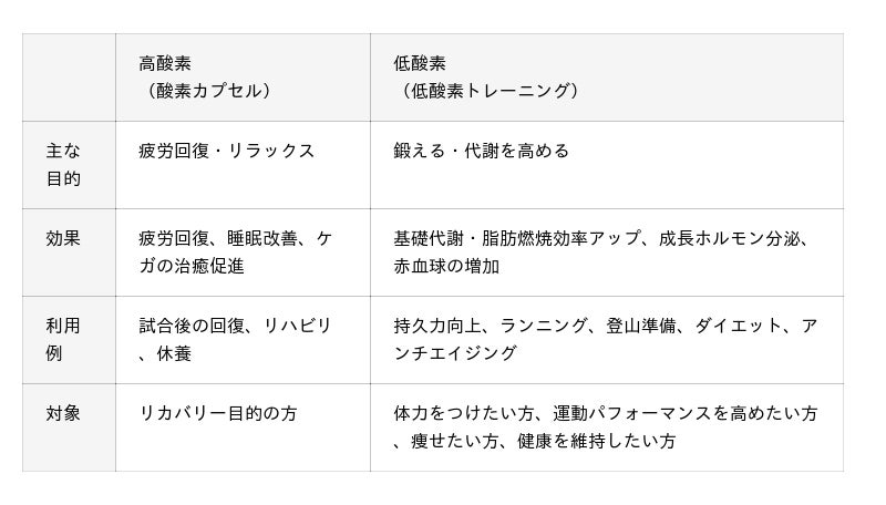 つまり、高酸素は「その場で整える」、低酸素は「未来に備えて鍛える」という違いがあり、両者は補完し合う関係にあります。