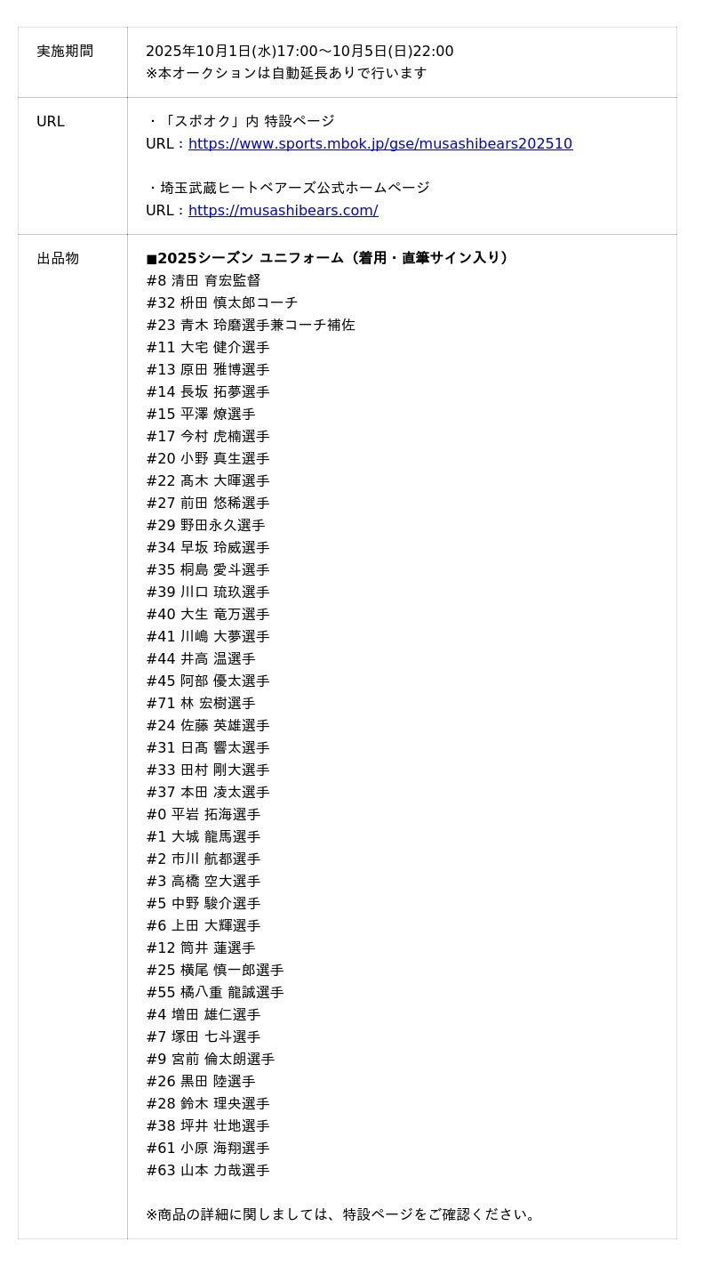 - スポオクにて、埼玉武蔵ヒートベアーズが直筆サイン入り2025シーズン ユニフォームのオークションを開催
