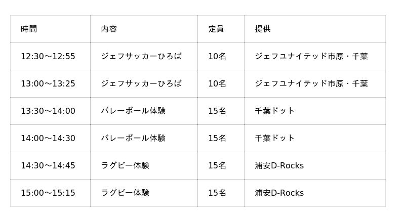 とよすなうみかぜ広場において、以下のスケジュールで各スポーツを未経験のお子さま向けのスポーツミニ体験教室を開催します。各回15分前からの受付開始(先着順)です。