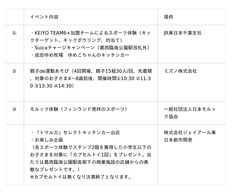 KEIYO TEAM6+の加盟チームと連携した体験コーナーの開催や、芝生の上で楽しむ親子運動、モルックなど、幅広い世代が参加できるアウトドアスポーツ体験を提供します。また、「成田ゆめ牧場」の自家製ジェラートやこだわりのバーガーなどキッチンカーが多数出店します。さまざまなイベントの合間に、お食事をお楽しみいただけます。小学生以下のお子さまには、スポーツ体験後、葛西臨海公園駅高架下の商業施設の店舗からの素敵なプレゼントが当たるカプセルトイを1回プレゼントする企画もご用意します。