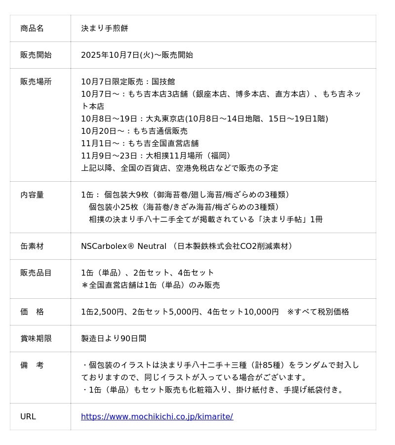 商品の総合監修は日本を代表するデザイナー「原 研哉(はら けんや)」氏が務めており、相撲の決まり手“八十二手”すべてが掲載されている「決まり手帖」や、相撲の力強さを表現し、素材に日本製鉄株式会社のCO2削減素材(GXスチール)「NSCarbolex(R) Neutral」を使用したブリキ缶(スチール缶)など、相撲の世界観やもち吉のこだわりが随所にみられる商品となっております。