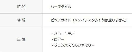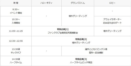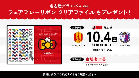 「ハローキティ」来場に伴いグリーティング以外にも、名古屋グランパスバージョンの「フェアプレーリボン クリアファイル」来場者全員プレゼントや、ファンクラブ会員限定の写真撮影会、「フェアプレーリボンプロジェクト」フォトスポット設置、ハローキティオリジナルグッズ販売などを実施いたします。