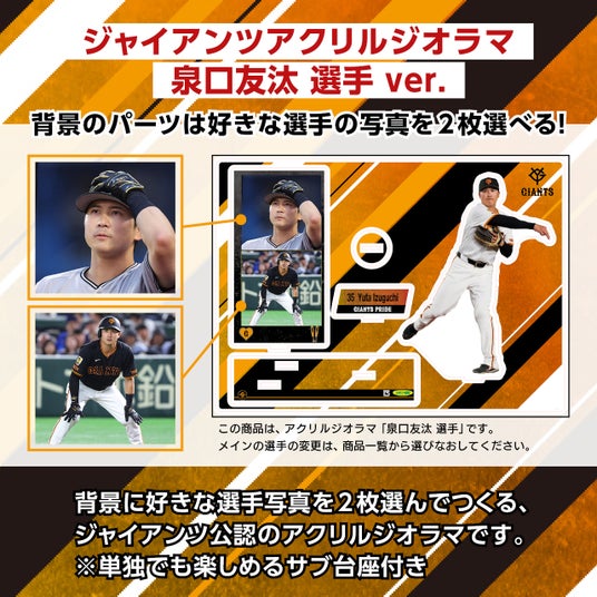 株式会社報知新聞社(代表取締役社長・長谷川剛)では、既に発売中の好きな巨人軍選手の写真を選んでつくる「ジャイアンツ アクリルジオラマ」に、泉口友汰選手を追加販売しました。サイトのTOPページに掲載する21選手の中からメインの1選手を選択し、背景に好きな選手写真を2枚選んでアクリルスタンドが完成です。メイン1枚+背景2枚が同じ選手でも、メイン1枚+背景2枚が違う選手でも選べます。今季ブレイクした泉口選手単体でも、他のお好みの選手を選択も出来る、自分でカスタマイズするオンライン限定商品です。10月30日(木)23時59分までの期間限定ですが、受注生産なため売り切れることはありません。是非ともこの機会に、世界に一つだけのジャイアンツグッズを完成させましょう。