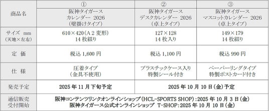 毎年、阪神タイガースファンの皆様にご好評いただいております「阪神タイガース カレンダー 2026年版3種類、(1)壁掛けタイプ・(2)卓上タイプ・(3)卓上タイプマスコット」について、10月3日(金)から阪神コンテンツリンクオンラインショップ(HCL-SPORTS SHOP)( http://www.hcl-sportsshop.com/ )で通信販売の先行受付を開始します。