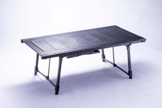 通常モデルの天板は折り畳み式ですが、本モデルは折り畳み構造を省くことで、よりシンプルで洗練された見た目を実現しました。また、樹脂パーツを使用していないため、ダッチオーブンなど熱い調理器具も直接置くことが可能です。