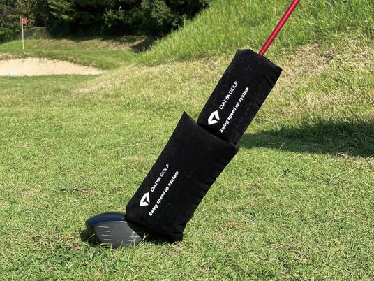 ドライバーに装着して使う空気抵抗式スイング練習器具。45gと70gの2サイズで負荷を調整でき、安定したスイング軸やヘッドスピード向上を体感。空気を抜けばコンパクトに収納でき、練習やラウンド前のウォーミングアップにも便利です。