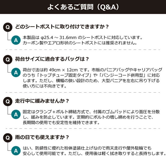従来のキャリアと違い、フレームにダボ穴が無くてもシートポストにボルトでしっかりと固定可能で、φ25.4~31.6mmの幅広いシートポスト径に対応し、多くの自転車に後付けできます。