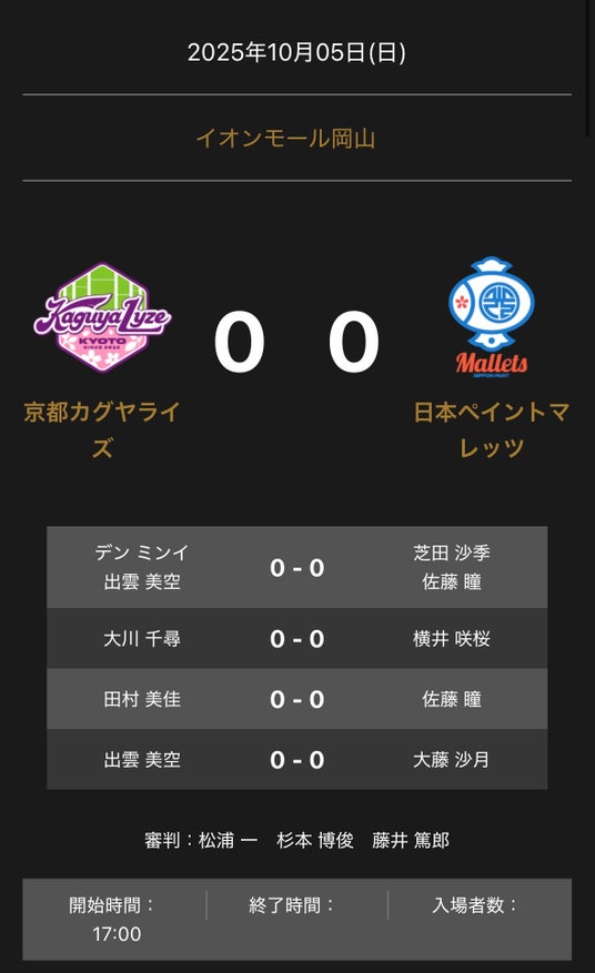 - ノジマTリーグ 2025-2026 公式戦 10月5日開催 京都カグヤライズ vs 日本ペイントマレッツ 対戦オーダー発表