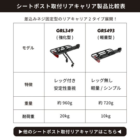 レッグ無しの軽量型(GRS493/最大10kg)に対し、本製品は補強レッグを搭載したダブルサポート構造を採用し、重い荷物や長距離走行時でも荷物のぐらつきを強力に抑え、高い安定性を発揮します。
