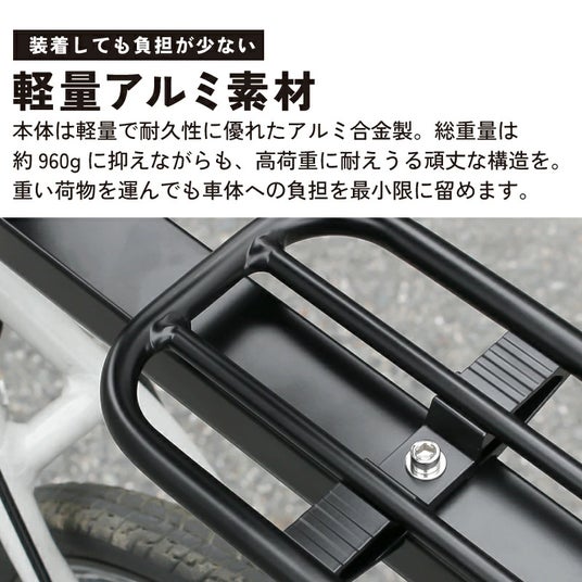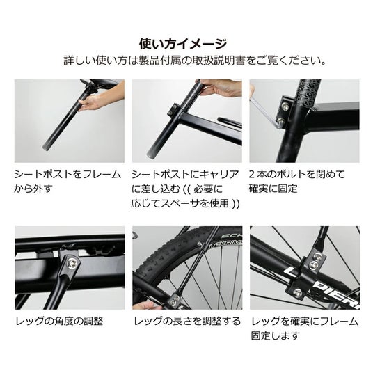 フレームにダボ穴がない自転車にも装着でき、シートポスト固定と強化レッグによる