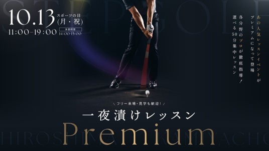世界最大級のインドアゴルフスクール「ステップゴルフ」を運営するステップゴルフ株式会社(本社:東京都渋谷区、代表取締役:榎本考修 以下、ステップゴルフ)は、「STEPGOLF 広島 紙屋町」にて、一日で上達のきっかけをつかめるレッスンイベント『一夜漬けレッスンPremium』を10月13日(月・祝)に開催することをお知らせいたします。