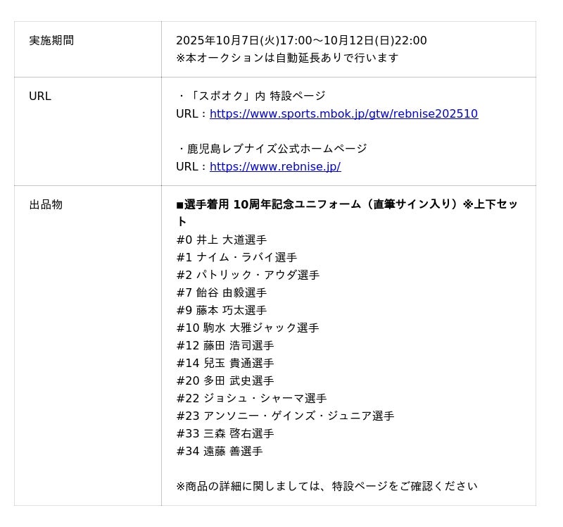 株式会社モバオク(本社:東京都渋谷区、代表取締役社長:小一原 宏樹、以下モバオク)がエンゲート株式会社(本社:東京都中央区、代表取締役:城戸 幸一郎、以下エンゲート)と業務提携し提供するスポーツチーム公式オークションサービス「スポオク」にて、B.LEAGUE所属の鹿児島レブナイズは2025年10月7日(火)より『鹿児島レブナイズ10th特別ユニフォームオークション』を開始します。