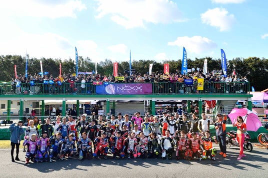 昨年開催の集合写真。トップライダーとファンはスタンドで一緒に撮影。ここから3時間の熱いレースがスタートした