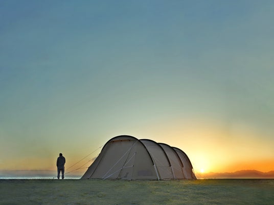 高さ240cm、収容可能人数8人の大型ドームシェルター「ファイヤーベース」。火の粉に強いポリコットン生地を使用しており、テントのすぐそばで火を扱っても穴が空きにくく、安心して焚き火を楽しむことができます。さらに、4面の入口を開放すればオープンタープとして、付属のフロアをつければテントとしても活躍。グループキャンプでのリビングはもちろん、ソロキャンプでゆったり使用するなど、状況や気分に合わせて自由に扱える一幕です。