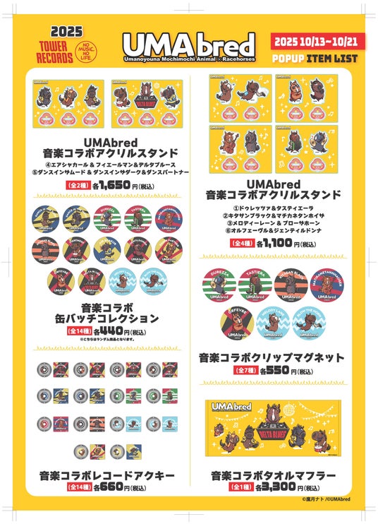 実在の競走馬・引退馬を「UMA」(ウマのようなモチモチアニマル)として描きおろすグッズブランド「UMAbred」は10/13(月・祝)よりタワーレコード渋谷店にて完全新規ラインナップグッズのPOPUPを開催いたします。
