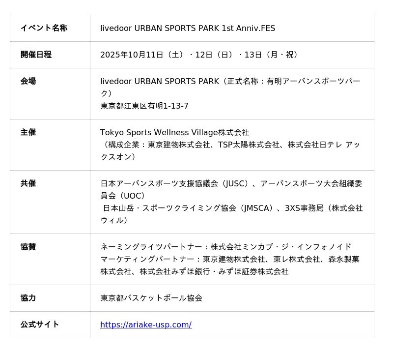 東京建物株式会社を代表企業とし、TSP太陽株式会社、株式会社日テレ アックスオンで構成するコンソーシアムが設立したTokyo Sports Wellness Village株式会社が運営する「livedoor URBAN SPORTS PARK」(東京都江東区有明、以下「本施設」)は、開業から1周年を迎えるにあたり、2025年10月11日(土)~13日(月・祝)の3日間にわたり「livedoor URBAN SPORTS PARK 1st Anniv.FES」(以下「本イベント」)を開催します。また、本イベント初日の10月11日(土)11時から11時50分まで実施するオープニングセレモニーの登壇者が決定しましたのでお知らせいたします。