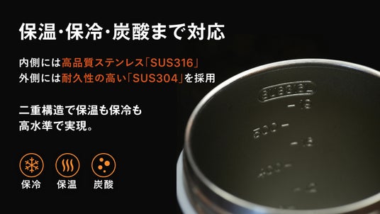 内側に医療機器グレードのSUS316、外側に高耐久SUS304を採用し、真空二重構造で保温・保冷性能を両立しました。