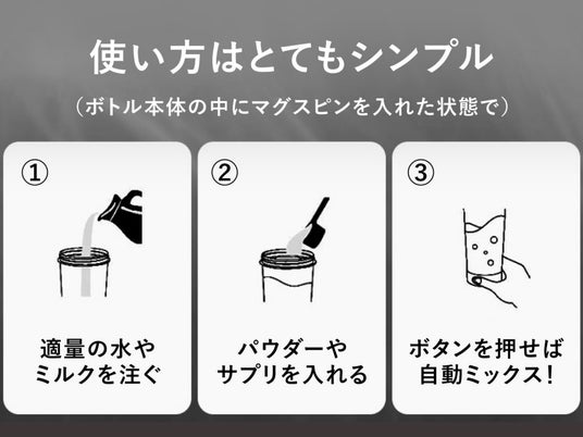 ボタンを押すだけで約30秒間自動で回転し、プロテインや青汁などの粉末ドリンクをムラなくなめらかにミックス。