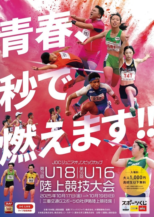 2025年10月17日(金)~19日(日)の間、三重県・三重交通Gスポーツの杜伊勢陸上競技場「第19回U18/第56回U16陸上競技大会」を開催いたします。