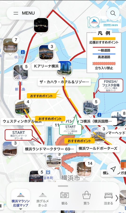 スタート・フィニッシュエリアを中心に、応援おすすめポイントや観光スポットを紹介します。ランナーを応援しながら、横浜の街歩きもお楽しみください。