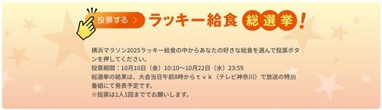 「ラッキー給食総選挙」は、横浜マラソン2025ラッキー給食の中から、好きな給食を投票いただける企画で、どなたでも投票いただけます。総選挙の結果は、10月26日(日)大会当日のtvk(テレビ神奈川)の生中継で発表予定です。