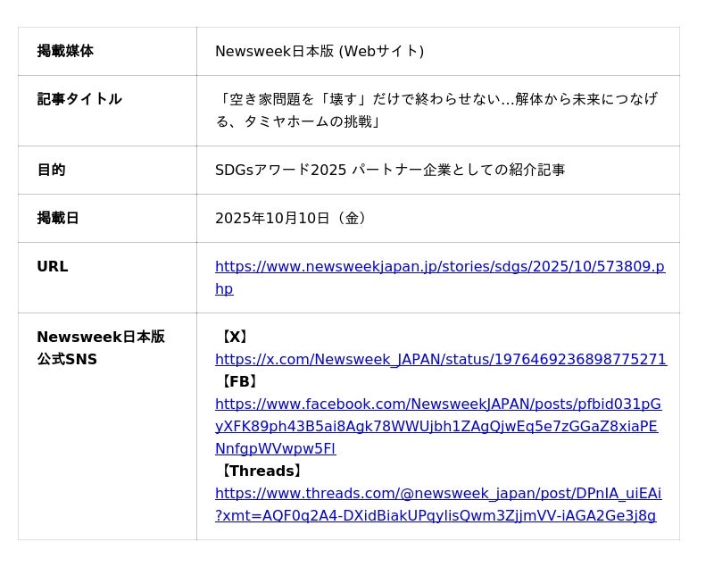 株式会社タミヤホーム(本社:埼玉県所沢市、代表取締役社長:田宮 明彦)は、このたび当社のSDGsへの貢献と事業を通じた社会課題解決への取り組みが、Newsweek日本版の「SDGsアワード2025」のパートナー企業として選出され、同ウェブサイトおよび本誌(雑誌)に掲載されたことをお知らせいたします。