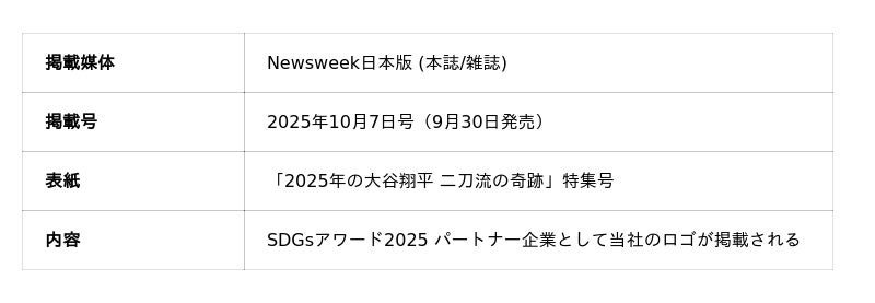また、本掲載に先立ち、大谷翔平選手が表紙を飾ったNewsweek日本版 2025年10月7日号(9月30日発売)の本誌誌面にも、SDGsアワード2025のパートナー企業として当社のロゴが掲載されました。国民的英雄である大谷選手と同じ号に当社のロゴが掲載されたことを、大変光栄に感じています。