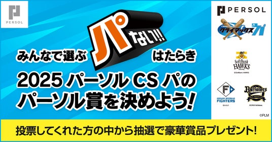 パシフィックリーグマーケティング株式会社(本社:東京都港区、代表取締役CEO:新井 仁)は、2025年度パシフィック・リーグタイトルパートナーであり、クライマックスシリーズ パ協賛社である総合人材サービスのパーソルホールディングス株式会社(本社:東京都港区、代表取締役社長 CEO:和田 孝雄)が「2025 パーソル クライマックスシリーズ パ」のパーソル賞をファン投票で決定し、抽選で豪華賞品が当たるキャンペーンを実施することをご案内いたします。