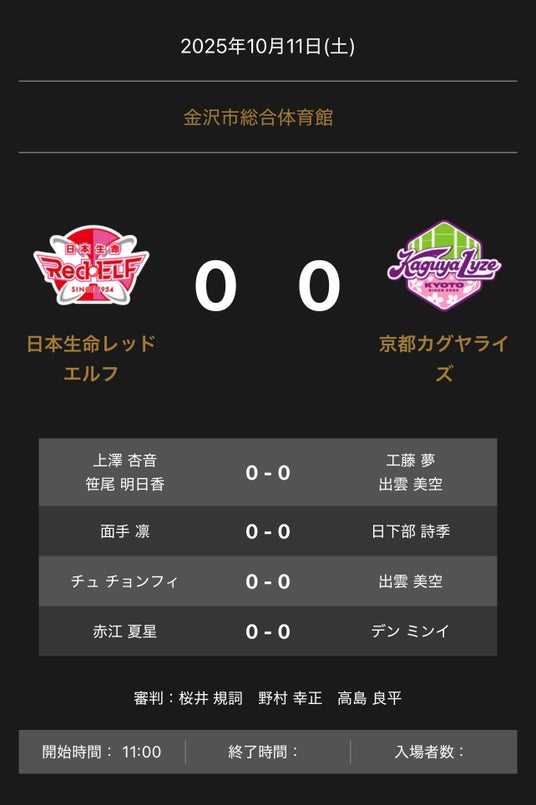 - ノジマTリーグ 2025-2026シーズン 公式戦 10月11日開催 日本生命レッドエルフvs京都カグヤライズ 対戦オーダー発表
