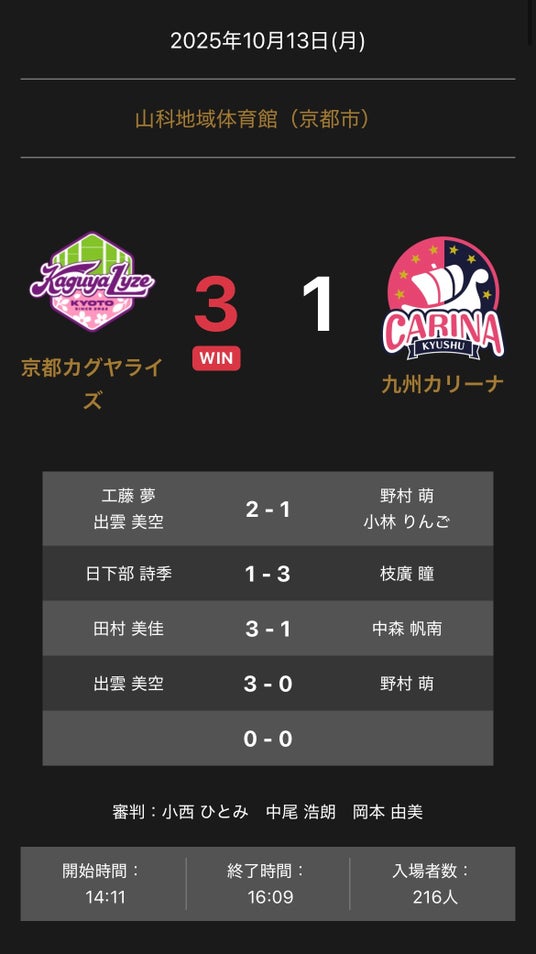 - ノジマTリーグ 2025-2026シーズン 公式戦 10月13日開催 京都カグヤライズ vs 九州カリーナ 試合結果