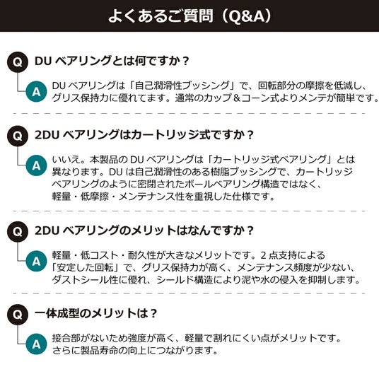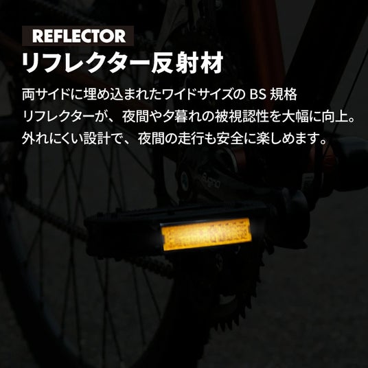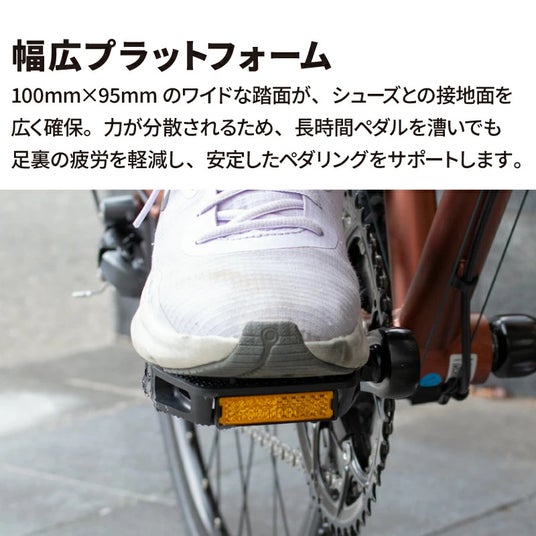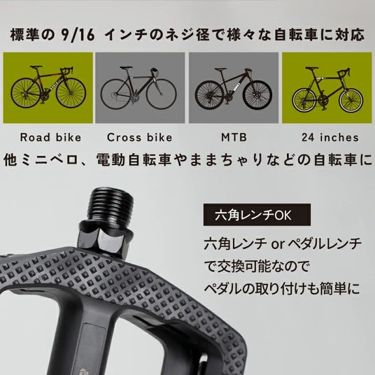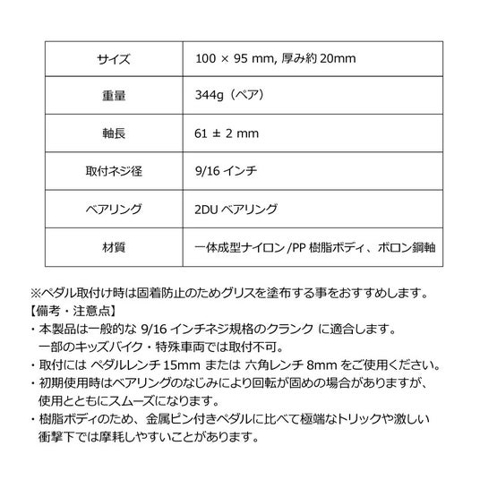 ・本製品は一般的な 9/16インチネジ規格のクランク に適合します。 → 一部のキッズバイク・特殊車両では取付不可。 ・左ペダルは逆ネジ 仕様です。取付時にはご注意ください。 ・取付には ペダルレンチ15mm または 六角レンチ8mmをご使用ください。 ・初期使用時はベアリングのなじみにより回転が固めの場合がありますが、使用とともにスムーズになります。 ・樹脂ボディのため、金属ピン付きペダルに比べて極端なトリックや激しい衝撃下では摩耗しやすいことがあります。