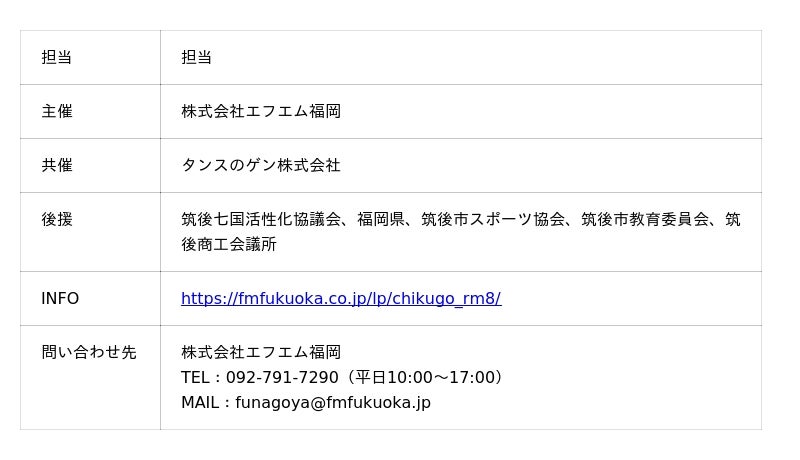 家具・インテリアのEC事業を展開するタンスのゲン株式会社(以下、タンスのゲン、本社:福岡県大川市、代表取締役:橋爪裕和)は、福岡エリアでラジオ局を展開する株式会社エフエム福岡(本社:福岡市中央区)と共催する形で2025年11月22日(土)に、福岡県筑後市の筑後広域公園にて『筑後スポーツフェスタ』を開催することをお知らせします。